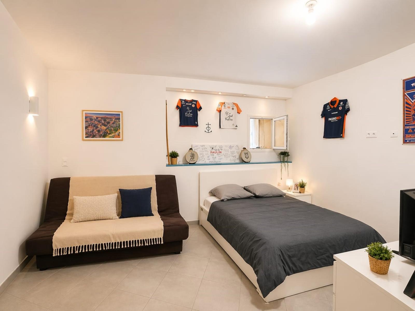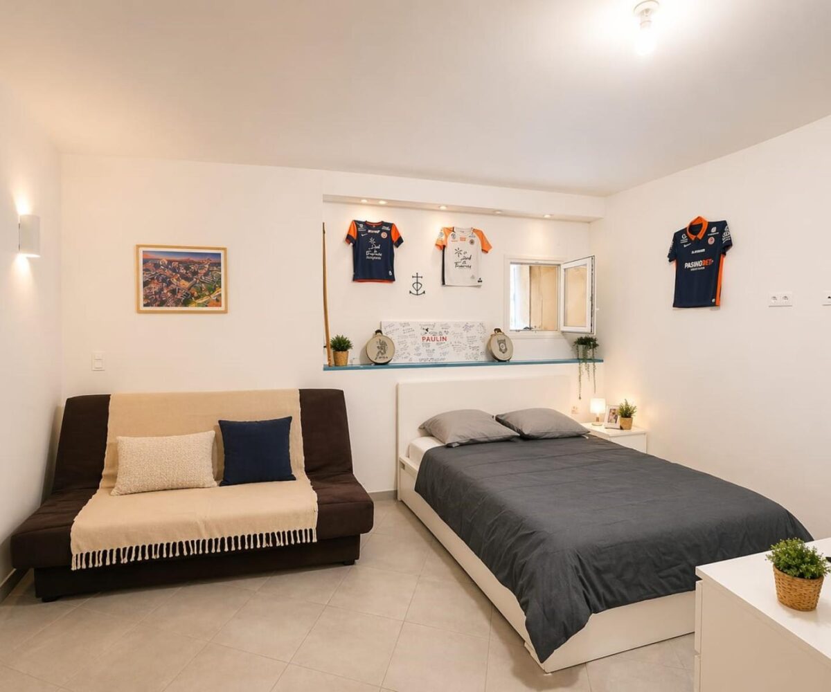 Elle se compose, au rez-de-chaussée, d’une grande chambre de type studio d’environ 30 m², avec buanderie et WC.