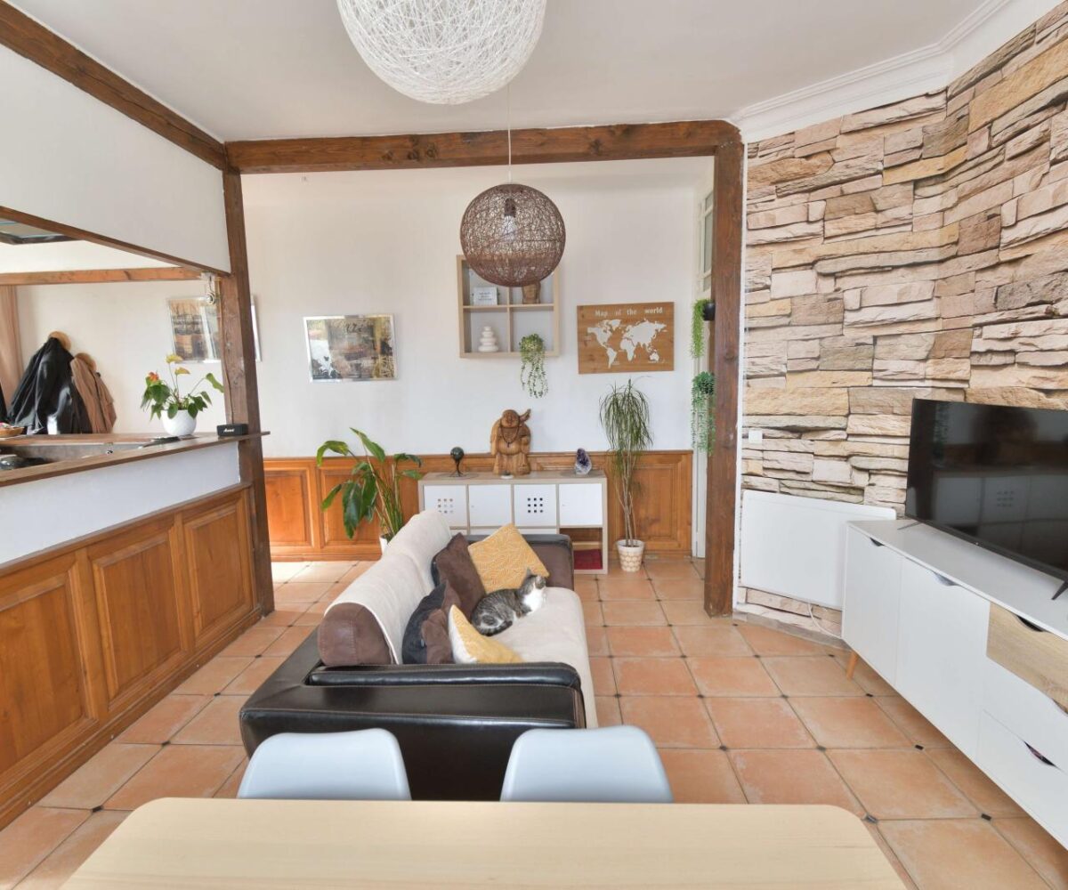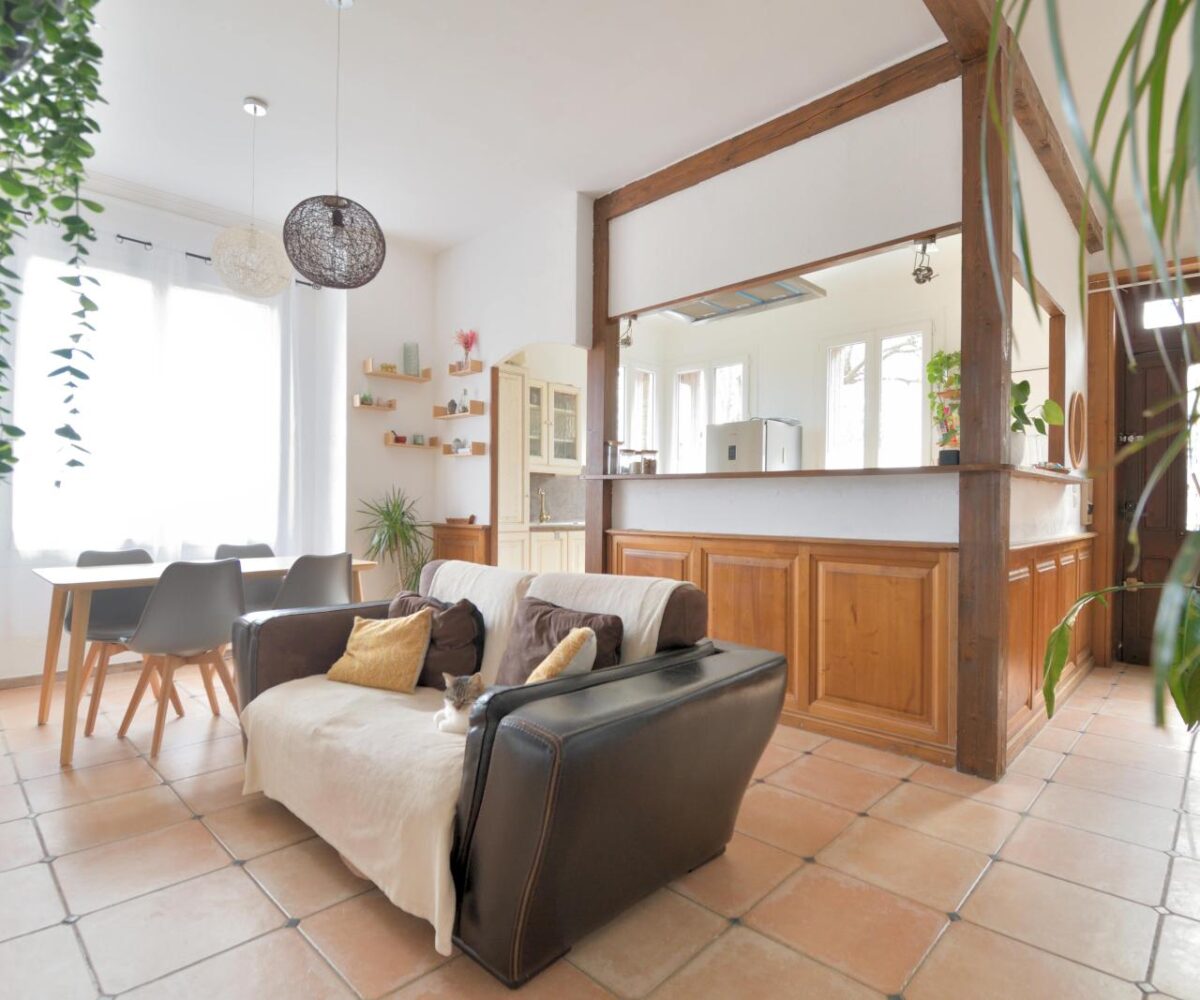 Le rez-de-chaussée offre une agréable pièce de vie lumineuse d’environ 33 m² avec cuisine ouverte, complétée par un cellier/buanderie.